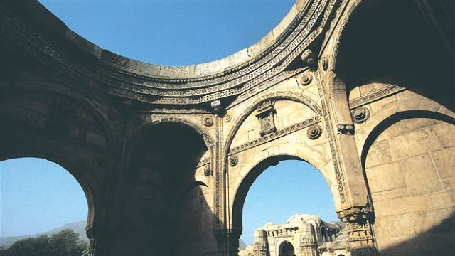 Perhaps the most ambitious of the constructions here is the seven rings of fortifications—with an ingenious network of gateways, watchtowers, garrisons and barracks—that rise up the hill. Joshi and I walk along the labyrinthine fort walls from Khapra Zaveri until we come to the Sat Kaman, a series of seven arches (one has fallen) built of local yellow sandstone. The arches support high walls resembling a bastion, which contain large openings that were perhaps used to dispense gun powder. Behind Atak Killa, one of the fort walls, is a curious sight—73 trapezoidal structures of parallel walls. Their purpose seems obscure until Joshi explains they were catapults used to hurl immense rocks at unsuspecting enemy soldiers.