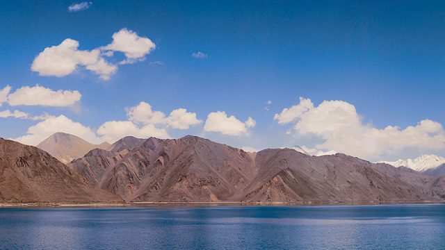 Long stretches of brown. Crevices on a mountain ahead like stitch-marks on skin, the upper lip of a wizened woman. We pass the campsite at Mukleb where we have to stay the night. Spending the night at Pangong, the queen’s chamber, is forbidden. You could be a security risk. A spy. Or have weak lungs. A seizure. Suddenly, a turquoise bead on the mud, fallen off a larger ornament. “That’s Pangong Tso,” says Angchuk. Just the tip. The bead vanishes as quickly. The landscape is moving towards a climax. Featureless, prickly mounds get smoothened out to hand-patted chunks of clay.