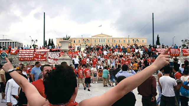 The next evening, hours before the match, Syntagma Square in front of the Parliament had been comprehensively trashed. There was trash and beer cans everywhere, even the pavement underfoot was sticky with beer. The public fountains were foaming with beer. The people in red were tanked and roaring. There were no Italians to be seen.