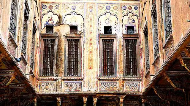 The following day, we started on our journey to Nawalgarh, a few kilometres from Mandawa, after a hearty breakfast of puri sabji. Nawalgarh was a dusty old town, probably looking almost the same as it did a hundred years ago. The first haveli we went to was the Koolwal Haveli. At this point of time I had no idea what to expect – it was a 140 year old abandoned structure entirely covered in frescoes. The front porch was huge and was covered with family portraits of the past five generations of the family. I was gaping at these portraits when I noticed something quite peculiar – the portraits of all the women of the family had their faces scratched off. My enquiries were in vain, nobody was ready to explain. The haveli was a double-storied structure with two courtyards on the ground floor. The outer courtyard, I was told, was only accessible to the men of the family. It was here that they would conduct their business; the women were only allowed to watch the activities from the second floor, through tiny ornate windows or jharokhas. The second courtyard was for women; it was surrounded by a kitchen, store rooms and a tiny room which was only used for storing water. The walls of the house were covered with beautiful frescoes and murals which depicted mythological scenes from the Ramayana and the Mahabharata. They were so detailed that it took us almost an hour to go through them all.