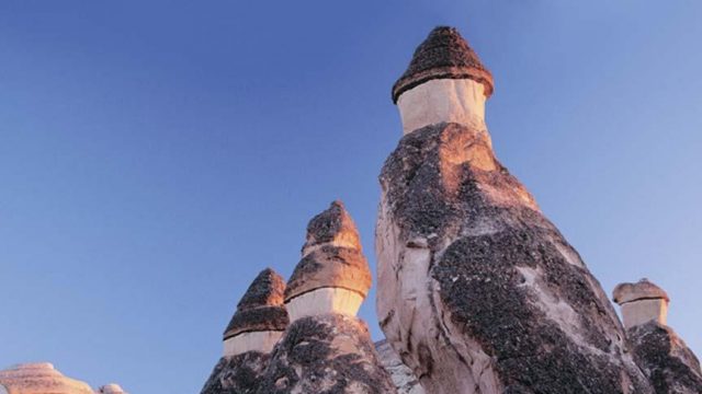 I edged along a gorge from which rose what looked like oversized toadstools: soaring perpendicular columns wearing gently rounded caps that looked as though they had been shaped by man. “The caps are made of basalt, a hardy substance that is more resistant to erosion than the tufa columns on which they sit. So, while the forces of nature easily eroded the tufa, the sturdier basalt remained, forming these protective caps,” Baris enlightened us.