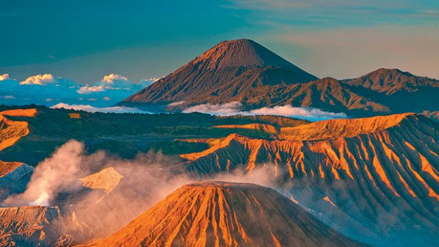 One of the finest places in the world from which to watch a sunrise is also one of the most accessible and climbable active volcanoes anywhere. Gunung Bromo simmers in East Java, its landscape other-worldly in its beauty. Visitors begin their climb up 253 stone steps carved audaciously on the slope in the middle of the night to arrive, panting but ecstatic, to a magnificent play of colours on the top. Dawn spreads over the Laotian Pasir ‘sea of sand’, the dramatic vistas of the Tengger massif and Bromo’s hissing crater, all of which is as unreal as it is unforgettable.
