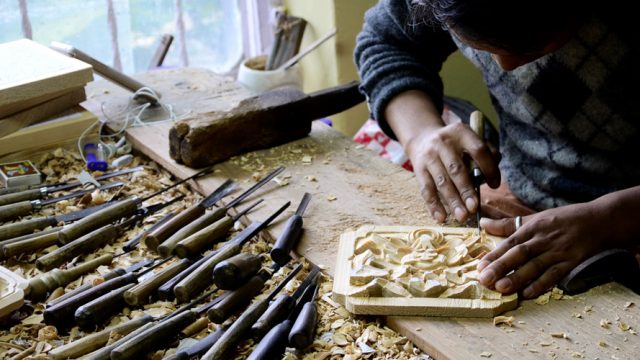 At the wood painting workshop, I was greeted by the Master Artist and escorted to my workstation, where I was to get started with the practice piece, before attempting the final one – a framed wall hanging. The artisans at Norbulingka follow the traditional Tibetan style of relief painting called kyumbur, which is generally used in temple frescoes, but has now been adapted to being used on wooden furniture and decorative arts. The kyumbur technique adds depth and texture, lending a three-dimensional look to a design on an otherwise flat surface. However, it requires an immensely steady hand to trace the design on wood, using a syringe filled with a stiff mix of paint and carpenter’s glue. The Tibetan artistic tradition has a vast repertoire of designs that not just include Buddhist motifs, but also nature-based motifs from India and China, as well as geometric patterns from Central Asia. Students are free to work on any design from the range of choices available; however, it is a good idea to choose a fairly simple one, if you don’t have prior experience in wood painting.