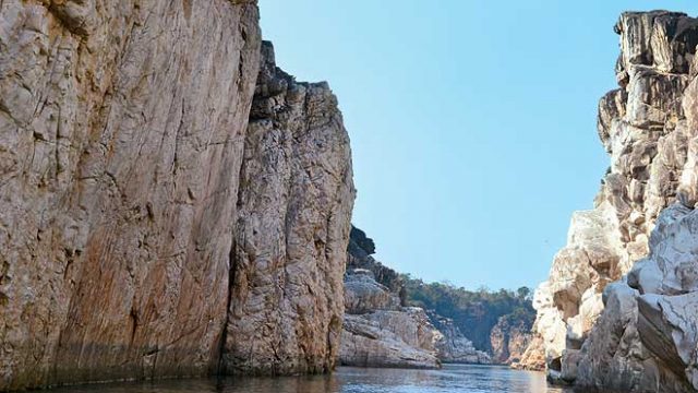 The misty marble-rock waterfalls of the Narmada at Bhedaghat, near Jabalpur, can be crossed by ropeway or admired from the Panchwati nouka vihaar or boathouse. Called the Dhuandhar, this majestic fall is a favourite with visitors to Jabalpur and its wild braids also draw in pilgrims from the Chausath (64) Yogini temple nearby. The falls are supposed to be a sight to behold from a boat on a moonlit night, and the powdery white sculptures from the local white soapstone make a popular souvenir.
