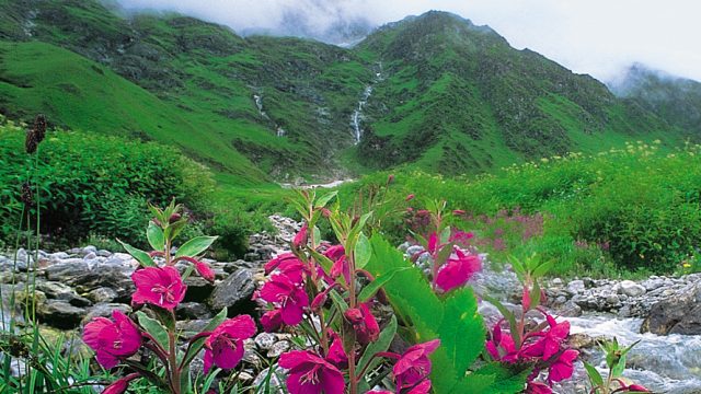 The Valley of Flowers bursts upon you as an absolutely radiant canvas. Flowers plummet down from rocks, proliferate over every inch of space and devouring every morsel of soil. In May, large parts of the valley are full of blue primulas. In June, it is the purple-red of geraniums that dominate, but gives way to herds of lanky, fragrant polygonums in September. Monsoon time is when maximum flowers bloom. The valley is home to a bewildering variety of plants; in a few square kilo metres there are a hundred plant species to be seen. At the far end of the valley is where the Pushpawati spreads out into many streams.