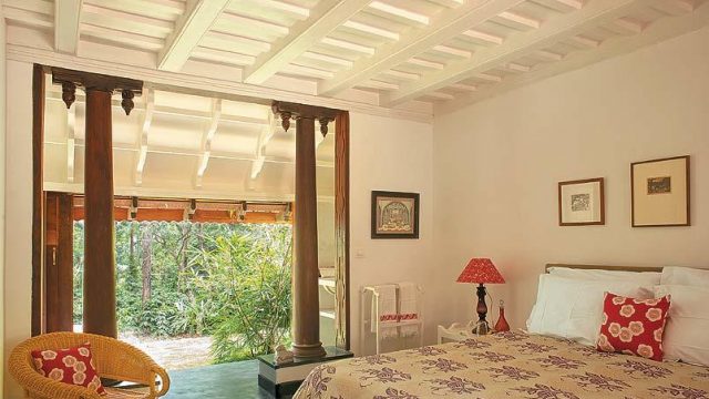 Occasionally, we pass clusters of houses that make up the villages, till a rusty board announces that we’ve reached Manjalparpu. We fork off to the left and rattle uphill on a stony path through coffee plantations and, when we reach, I am quite unprepared for the unostentatious beauty of the house that sits lightly on top of the hill. A column of wooden pillars supports the sloping Mangalore-tiled roof. The building itself is low-rising and the roof is punctuated with small turrets, supported by carved wooden brackets. The effect is created by the elevation and the elegant proportions of the building and, for the eye that has grown accustomed to polish, the natural, unvarnished texture of the wooden walls. This is the Rajakkad Garden hotel, an eighteenth-century Kerala-style house that was transported from its original location in Kottayam and rebuilt painstakingly in the middle of a fifty-acre coffee plantation. This is the hotel’s first season, the first year that it has been opened officially to guests.