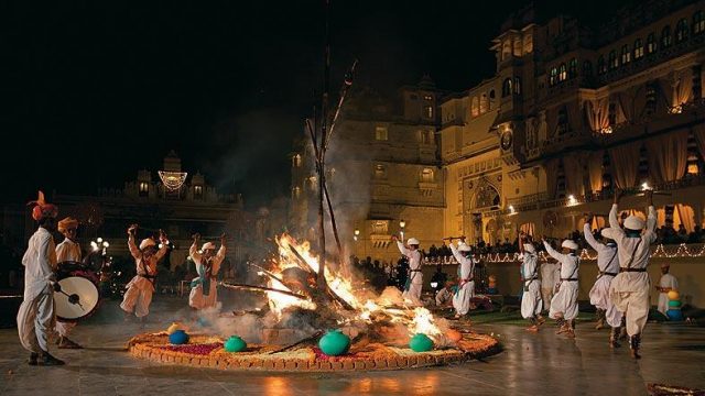 Tonight though, the maharana of Mewar and his family are entertaining private guests here. I walk past the lawns at sundown, even as the tables are laid and the lights hoisted on to the beautiful overhanging jharokhas. The mikes are tested, the tanpura tuned for a khayal recital by Ashwini Bhide from the Jaipur-Atrauli gharana. But for now, it’s the marching retinue of liveried men and their humdrum band that commands the attention of eager out-of-towners like me. They’re among the party that will set Holika ablaze tomorrow — leading the maharana’s procession or noubat ri avsari — at that hour when the aarti at the nearby Jagdish Temple ends with the jangling of bells. And the watery, full moon rises from its twilight slumber to turn the city, a spotless, sterling silver.