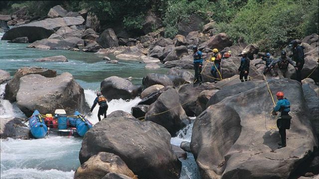 Currently, the river, which has been steadily gaining momentum and flow from our put-in two days ago, appears to be demanding something along the lines of a sacrifice. We’d managed to avoid any mishaps at Class IV Kunighad Rapid, a chute whose name means ‘bloody creek’, the day before, our first of real excitement; two portages have taken place in the meantime. After roping the rafts downstream over a bony drop with lines not even the kayakers dared attempt, we carried the rafts around a constriction known as Main Squeeze, where undercut boulders and swirling hydraulics formed a likely deathtrap for inadvertent swimmers. Given that we are still a 10-plus-hour drive from decent medical help, Kala remains anxious that we take extra care on this five-day commercial-expedition hybrid trip. “Safety first” is more than an idle mantra here.