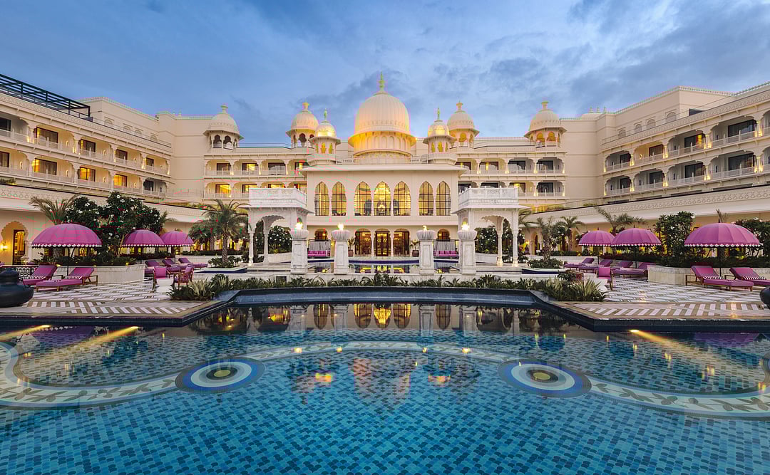 Constructed from locally sourced stone and designed to echo the grandeur of royal Rajasthani architecture, the hotel houses 327 rooms and suites, eight dining concepts, and seven event spaces