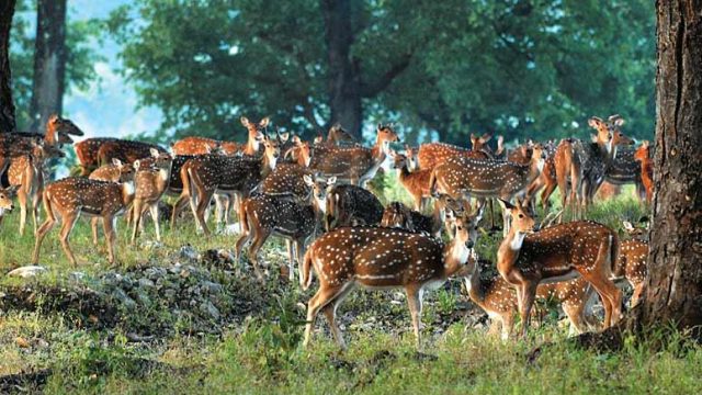 The forest rises slowly out of the mist, like a fuzzy dream taking shape. Outlines of lake and tree and shrub merge and mesh in the palest pastel hues as if someone had run a wet brush over a watercolour. The sun is still formless, only a brightening of light behind the trees. The cold of middle October is already a sharp thing, reaching out its icy, smoky tentacles from the meadows on either side and clutching us as we drive past. Then, the antlered heads and shoulders of three barasingha rise from the smoky marshes, etched black on the dawn, their gravely worried looks fixed on us. The rescue from near extinction of this rare species of hardground swamp deer is one of Kanha’s biggest successes. As the red disc slowly rises, the forest shapes solidify, get real, and now the birds can be heard and seen.