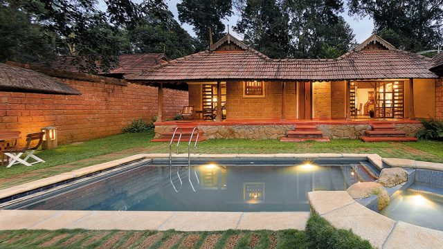 I revel in my gorgeous Heritage Pool Villa, built in traditional Kodagu (Coorg) style. It has beautiful mahogany furniture, the kind found in a colonial planter’s bungalow—19th-century dressing table, desk and four-poster bed (complete with 21st-century pillow menu and 800-thread count sheets). Planter’s chairs in the verandah overlook the private pool and jacuzzi in the enclosed garden. In the airy, high-ceilinged living room are paintings of local plant species on the walls. As part of the resort’s responsible tourism initiatives, there are no mineral water bottles—the villa has its own reverse osmosis water supply. Toiletries are in refillable ceramic bottles, and bath water is recycled for watering the grounds.