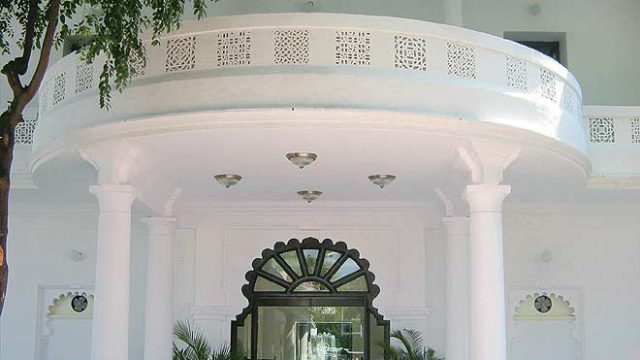 The Garden Hotel at Udaipur teems with greenery inside and out. Across the street is Gulab Bagh, a tree-lined landscaped garden of several acres built by Maharana Sajjan Singh in the 18th century. In the courtyard of the colonial-style, circular hotel are neem and peepul trees, potted plants, bougainvillea hedges and a fountain.