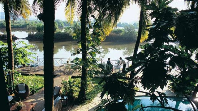 The notional lobby, really a breakfast room/lounge, has lemon walls, cane-backed chairs, an upright harmonium that looks like a toy harpsichord. On the wall, on panels either side of the harmonium, are large paintings of a small cat and a potted plant. Head through past the glass-fronted double doors and you’re out on the pool-deck. Everywhere you look is cane, wooden loungers, plants, and, in the shade of lanky coconut trees, a small swimming pool glistens wetly like a seal. Beyond the pool is a river, wide and of bovine placidity. Eat lunch here, looking out onto the river and the scrub, and the idea that Panjim is just five kilometres away, that the beaches of North Goa and their sweaty, flabby crowds seems not just absurd but unconscionable. You don’t want to be reminded. An English couple on holiday in Goa for just a week told us they’d been in the hotel three days and had yet to step out, “apart from a short stroll through the village”. Late in the afternoon, they’re still out on the pool deck: he, asleep, his Roddy Doyle discarded, she, sunbathing in the disappearing light.