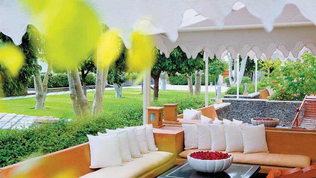 From an extra wide sun lounger in chic shades of taupe, I take in my surroundings. A dark stone swimming pool reflects the sky — an arc of blue with soft twists of cloud. A scattering of guests lie under white canvas pavilions, attended to by hotel employees in vermillion saris. Beyond the pool, I can see the green tops of a neat avenue of coral trees in one of many well-landscaped courtyards. The palace rises to my right, a vision of turrets and balconies and scalloped ramparts in the palest yellowy cream. A darting parakeet flashes green against it. And behind me a blaze of bougainvillea folds over the fort walls giving on to a brownish-green landscape — the ancient Aravalis rise in dollops and seem to radiate forever.