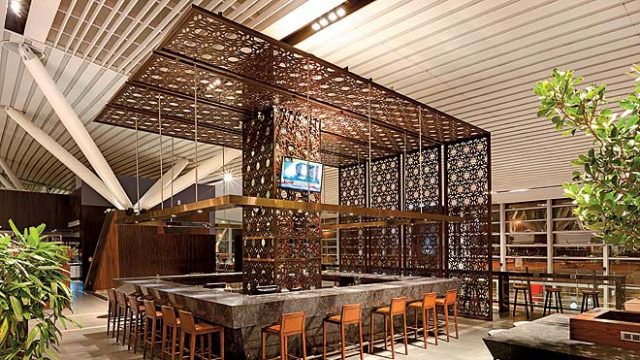 The domestic lounge, which has more visitors during the day, is flooded with sunlight through a large glass pane fitted into the ceiling. And natural light is energising, just what a daytime traveller needs. A long counter with barstools runs parallel to a glass wall that lets one see the tarmac outside, with the aircraft in various stages of preparedness. In contrast, the international lounge, occupied mostly at night before the red-eye flights, is a softly lit, relaxing space with various quiet corners. Both the lounges have a variety of seating areas and options — for instance, besides the usual rows of large single-seater chairs for catching a nap, there are barstools arranged around tall tables with plug-in points (at the domestic lounge), and a bar area with low seating (at the international lounge). The international lounge even has a plush majlis-type room for eight, complete with huge cushions for reclining and a massive chandelier; this could have been a suite drawing room at a boutique hotel. Lounge visitors can access this room by pre-booking — perfect for group travellers in need of an extra dose of privacy. The two lounges offer beautifully done up spa rooms and a range of therapies.