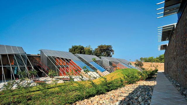 It is late evening, and pretty cool, by the time we pull up at the Mana hotel, Ranakpur. A strange looking edifice is glowing quietly in the dark. Are we still in Rajasthan or is this a remote part of the galaxy I’ve inadvertently hitchhiked to? If you’ve had an overdose of grand Rajasthani architecture and attendant opulent interiors, Mana will come as a pleasing shock to the system. As the glass doors close behind me, I find myself in an über-modern lobby that is pure function. I’m checked in swiftly, then promptly ushered to my ground floor villa accommodation, which is behind the main building. The villa’s walls are partly stone and partly glass, all held together by a simple metal frame. It’s too late for any further investigation — all that must wait till morning. I’ve always held that the test of a strange bed is how well you sleep in it and I proceed to put this thesis to the test.