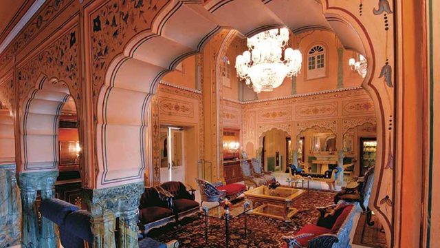 Tariff: Rs 15,000 to Rs 2 lakh. Meals: Breakfast: Rs 800, High Tea: Rs 1,000, Lunch: Rs 1,000, Dinner: Rs 1,200, Kebab Dinner: Rs 2,000, Maharani Thali: Rs 2,400. The restaurants are also open to non-resident guests. Location: Zorawar Singh Gate, Amer Road, Jaipur. Contact 0141-2634077, www.rajpalace.com