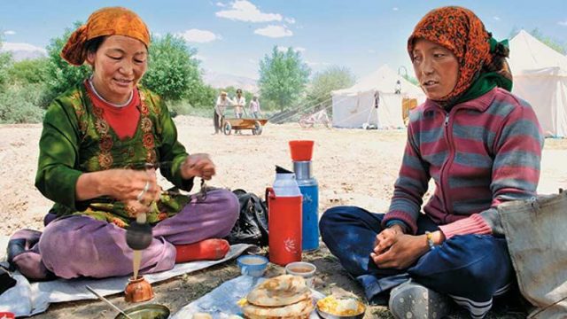 Photographer Puneet and I accompany him on one such walk to Palam village nearby. On the way, Laurige introduces us to Paul, the donkey with the mop-top, assorted cows, fields of barley, the local school, small whitewashed chortens and mud-brick homes. Palam’s main gompa, with sweeping views of the valley and Leh town in the distance, is sadly off limits to women. But an unexpected invitation to tea at kindergartener Tashi and his grandparents’ homestead more than makes up for my disappointment. In their world of soot-stained roof held up by rafters of poplar and a kitchen that doubles as family room, with neat rows of utensils and ornate traditional stove, conversation flows as freely as milky tea. By sunset, we find our way back to camp.