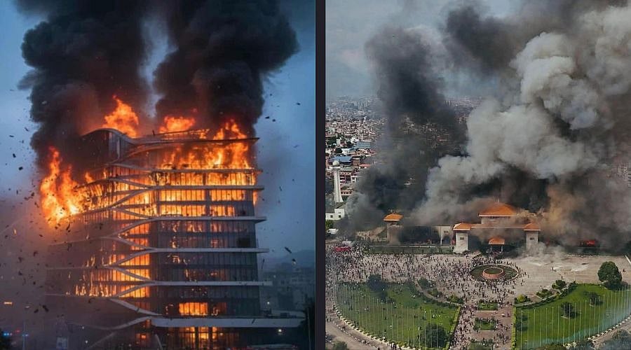 The Hilton Hotel in Kathmandu (left) and Nepal’s Parliament (right) set ablaze during the Gen Z–led protests Photo: X
