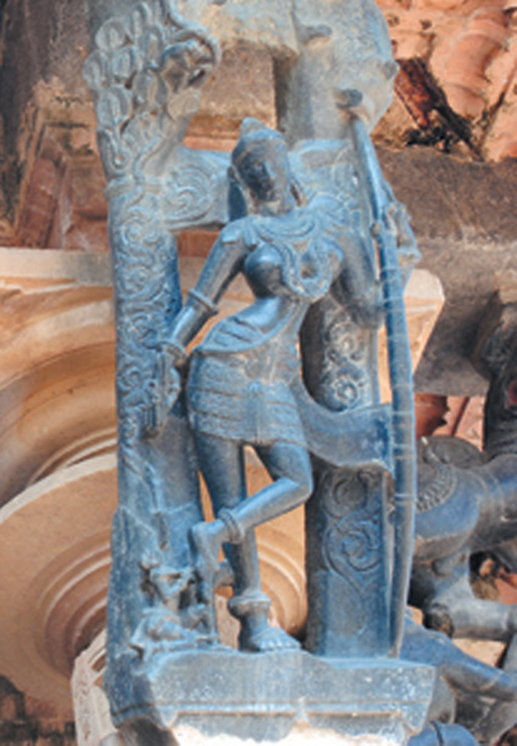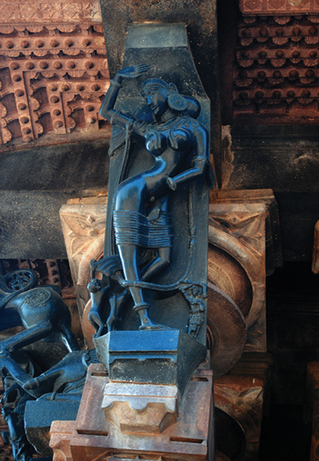 There are several elements in this temple’s architecture that make it unique. There are 12 black stone statues of madanikalu (dancing figures) perched atop pillars at the entrances to the main mandapam (pavilion). The facial expressions and body postures of the madanikalu are carved with great attention to detail – a monkey is seen pulling one madanika’s sari, another’s facial expression depicts anger, one madanika is shown wearing high-heeled shoes, one wearing just ornaments instead of clothing, an elaborate hair style can be seen on one and yet another is of a tribal woman who is hunting.