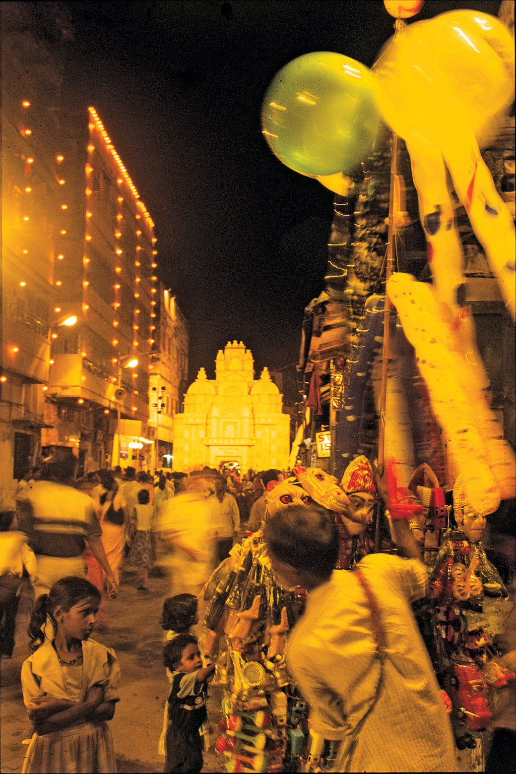 The city also wakes up to a variety of aromas. The fragrance of burning incense, of floral offerings, and of hot food emanating from thousands of temporary stalls that mushroom throughout the city, selling everything from paranthas to pancakes. Amidst this fusion of sounds and aromas, devotees dressed in vibrantly-coloured attire arrive in droves from the suburbs of Kolkata and dance on the streets. They hop from pandal to pandal, standing in serpentine queues for a darshan of the devi.
