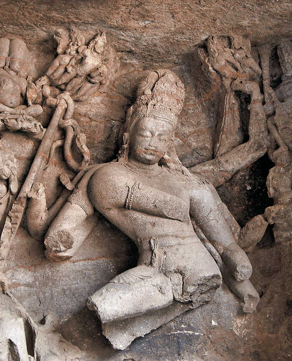From the pier, a short walk leads visitors to a steep flight of 125 steps that in turn lead to the temples’ entrance – a huge pavilion supported by two dozen pillars. In a deep recess in the rear wall is carved the massive triple-headed Shiva statue, known as the Maheshamurti. The three faces represent the three facets of Lord Shiva as the Creator, the Preserver and the Destroyer. There are other representations of Shiva as well: dancing as the Nataraja; slaying demons; playing chausar (game of dice) with Parvati and as the Ardhanarisvara.
