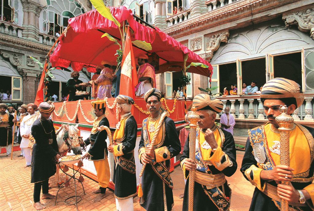 The palace is also where the Jambu Savari begins. A puja is held in a temple within the palace complex, after which the procession is inaugurated by the governor and the scion of the Wodeyar royals; at around 2.00pm, they climb a stage and shower flowers on the idol of Chamundeshwari, sitting in a golden howdah atop Balaram.