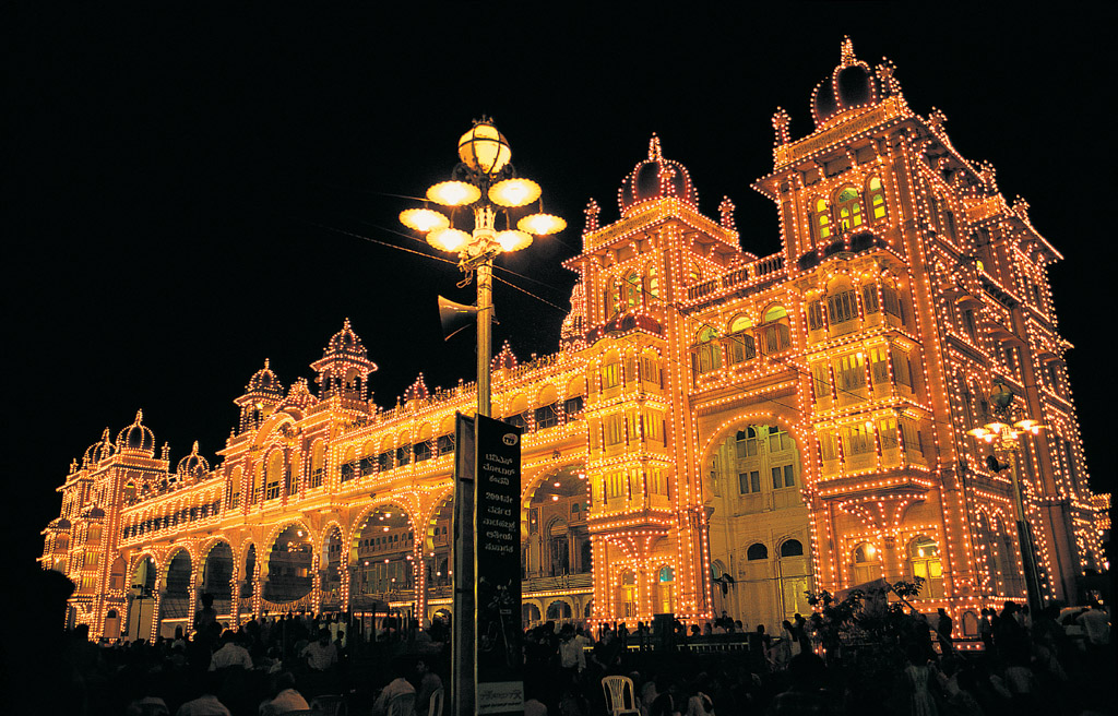 This procession, called the Jambu Savari, is the culmination of the 10-day long Dasara festival. The Mysore Dasara celebrations are spread out across several locations in the city such as Jaganmohan Palace, Town Hall and Kalamandira. However, the most important venue is in the grounds of the 20th-century Mysore Palace. This becomes an open-air setting with the majestically lit palace providing a stunning back-drop to classical Indian performances. Every evening, as the sun sets and spreads its reddish glow in the western skies, nearly 97,000 palace lights come on, all at once, converting the gigantic structure into a dazzling silhouette and leaving the assembled crowd agape.