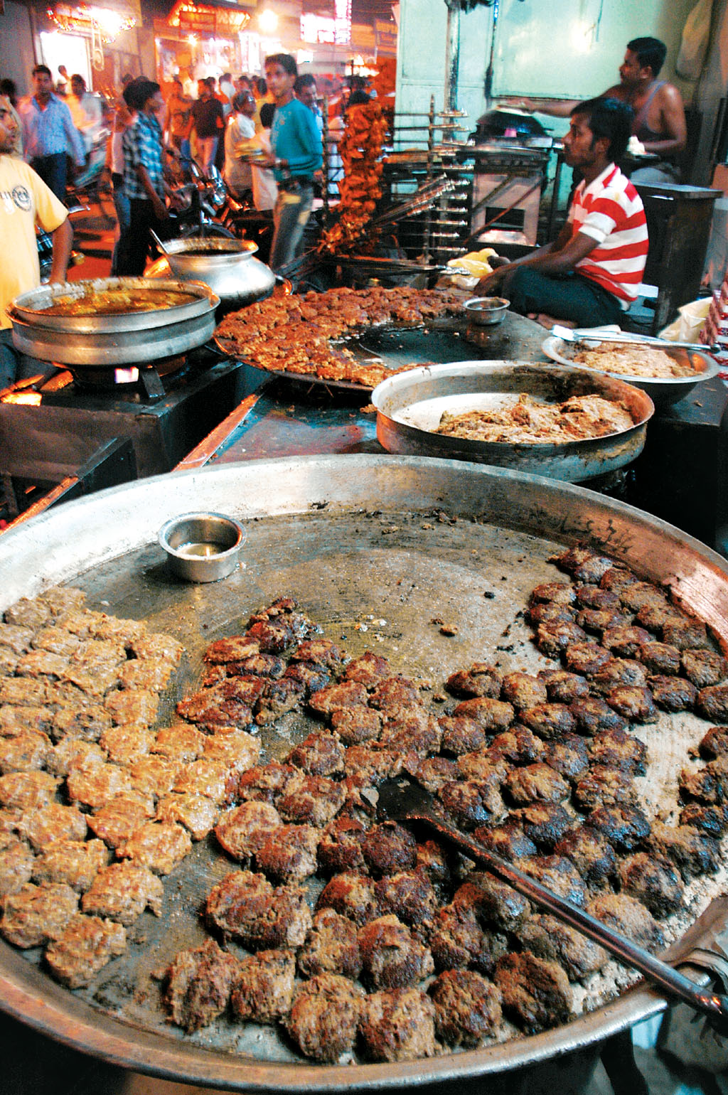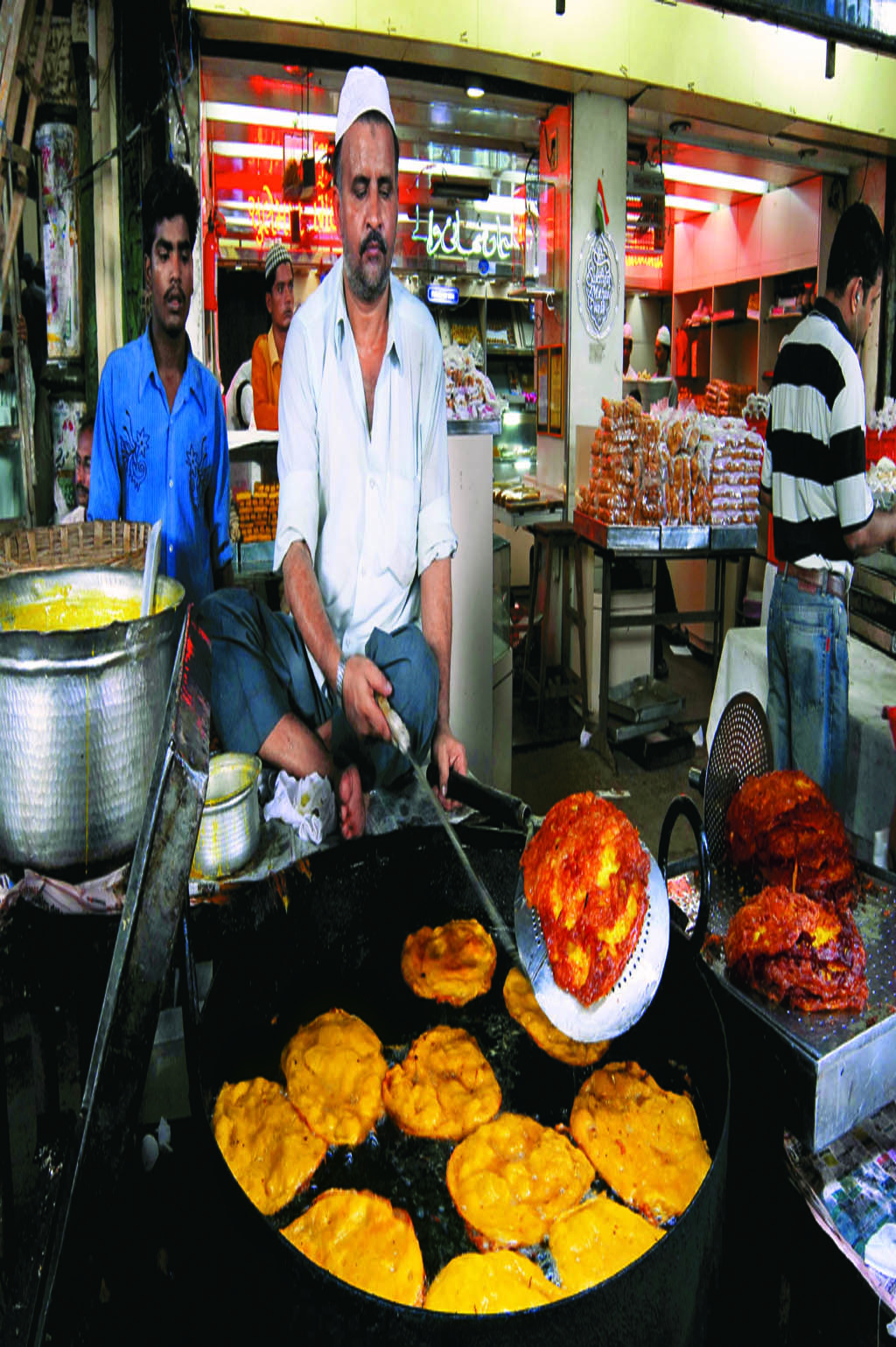Start your gastronomic indulgences at Chinese N Grill, which is famous for its tandoori chicken and chicken tikka. The tandoori quail and pahadi chicken kebabs, neatly arranged on skewers at the Janta Fast Food Centre, are irresistible. For those with a more adventurous palate, there is the zuban fry (deep-fried goat tongue) at Bademiya. The famous outlet also serves zuban soup, dil (heart) tawa fry and dil soup. At Bismilla’s stall, you can try roasted or fried khiri (udders) and kaleji (liver). For dessert, head to Noorani Milk Centre to try the gigantic malpuas or the phirni at Suleman Mithaiwala.