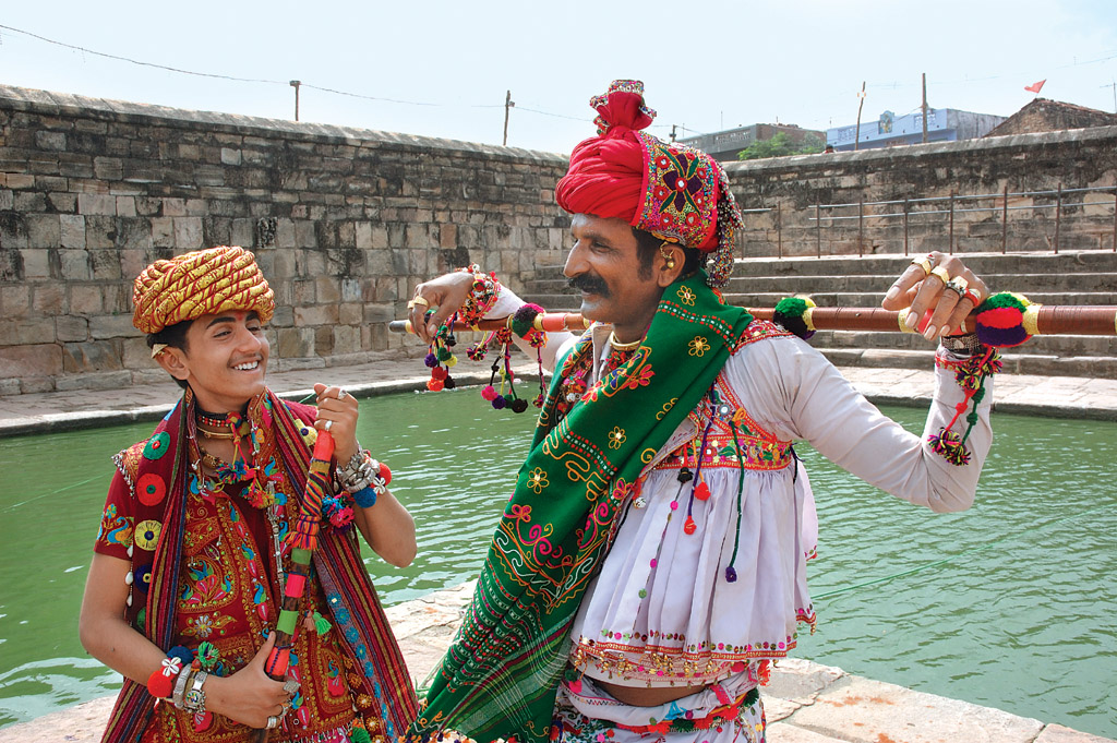 The Bharwads, a shepherd community, are known for the Hudo dance, which is usually performed at weddings. The dance is inspired from sheep fights, in which the animals lock their horns and ram their heads. A group of men or women in a circular formation sway to the sounds of dholak, harmonium, shehnai (oboe) and manjeera (cymbals). The Rabari women of Zalawad perform the Rabado dance. Interestingly, the colour of the women’s skirts traditionally signified their marital status – single women wear a red zimi (skirt), while married women wear a black skirt.