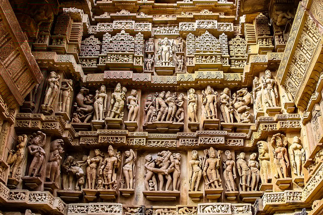 Close up of artful carved walls of Kandariya Mahadeva Temple, Khajuraho Photo: Shutterstock