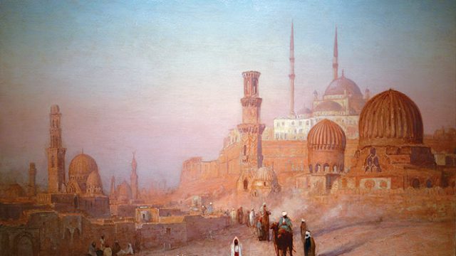 One of the greatest Art Nouveau painters was the New Yorker Louis Comfort Tiffany. Although he’s best known for his masterful stained glass works and for his artists’ group, the Associated Artists of America, his original medium was oils. As a young man, and before his interest in glassmaking began in 1875, Tiffany had travelled extensively in Europe, visiting ateliers and studios of noted Orientalist artists such as Léon-Adolphe-Auguste Belly. In 1870, he travelled through northern Africa, from Egypt to Morocco with his friend and fellow painter R. Swain Gifford. The Islamic cultures, their architecture and art was to form a life-long influence on the painter. The most immediate influence was seen in Tiffany’s oil paintings, which he exhibited in New York.