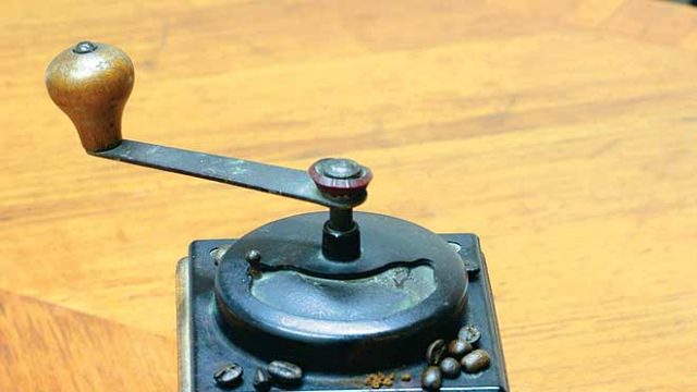 I can live without the smell of freshly ground coffee, but I can’t resist flea markets, and succumb even more easily to flea markets that sell interesting mechanical devices. I found this lovely chestnut-coloured coffee grinder (€20) at a flea market in the plaza between terminals I and II of the Munich airport. The coffee beans go in through an opening on top. A few turns of the handle (and the giant corkscrew shaft to which it is attached) and the finely ground powder falls efficiently into the tiny drawer below. I love working the machine—and the smell of freshly ground coffee wafting through the apartment every morning is a triumphant reminder of its efficiency.