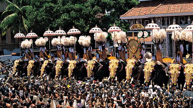 There are three men on each elephant and they sway whisks and peacock fans in coordinated patterns to the notes of panchavadyam (an ensemble performance of five wind and percussion instruments). They unfold coloured and sometimes multi-tiered parasols, the competitive designs of which are a closely guarded secret till the actual display. This is called the kudamattam or“changing of the parasols”. More festivities and fireworks follow in the evenings.