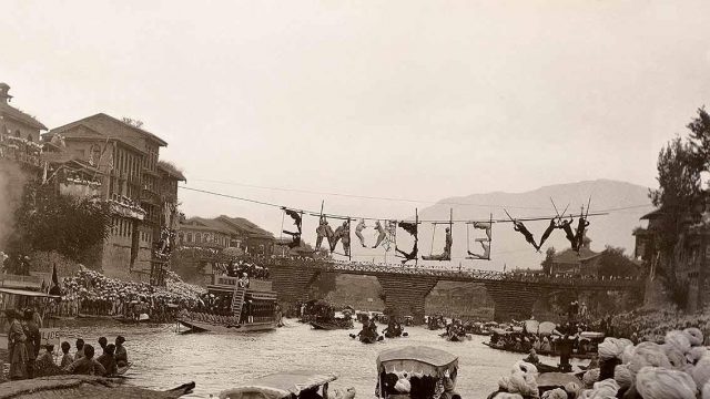 This picture in The Marshall Albums—although incidental to the main theme—is fascinating for its instant and evocative communication of a period. The caption ‘Welcome Made by Bodies on 3rd Bridge’ is disappointingly reticent with details. We have no idea as to the occasion or who is being welcomed with such enthusiasm, except that the bandobast appears to be top-rate. The police escort is impressive, the populace has turned out in strong numbers around the Fateh Kadal (or bridge) and the barge bearing the (royal?) welcome has an ornate umbrella heralding importance.