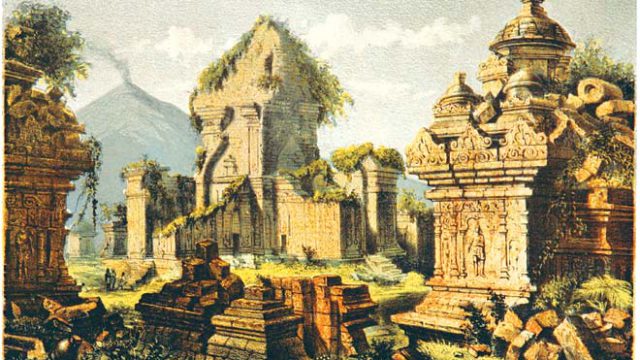 While under the aegis of the Dutch East Indies, the ruins were first studied, with lithographs and photographs of the ruins gracing many a Dutch memoir of Indonesia and its surrounding regions. This lithograph published in 1861 as an illustration in the book of a Dr. S.A. Buddingh, who travelled in this part of the world between the years 1852 and 1857. The main temple, in the background, dedicated to the Bodhisattva Manjushri, was first drawn in 1807 by H.C. Cornelius. The Java War and its aftermath took a heavy toll and re-construction could only begin in 1908. This somewhat dramatic lithograph, with the smoking Mount Merapi in the distance, captures a time when the complex was at its most vulnerable, ravaged by war. Compared to this state of devastation, Chandi Sewu’s present avatar is a miracle of sensitive and sophisticated restoration. No longer is it the dreaded abode of demons, but a sanctuary of serenity