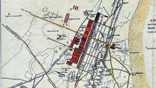 The title suggests, according to the book, that the map served a very specific purpose—representing the locations of barracks, infantry, cavalry, artillery batteries, and picket locations of the British military during the mutiny of 1857. In this respect, it might have been a guide for the counter-attack strategy. Besides the fact that the map was produced in 1857, a crossed-swords symbol on the top-left marks the “fight of June 19th”, which refers to the start of the mutiny. The book points out that the colours used on the map, too, hold military relevance—red indicates British camps, brown, the Mughal city, yellow, principal routes, and blue, rivers and canals.