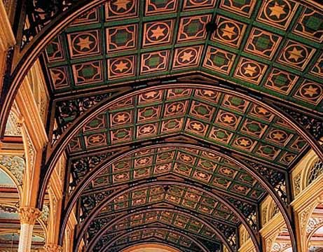 Rs 10 admission fee. Pass the unassuming entrance, click your way through the antique wrought-iron turnstile and feast your eyes upon the magnificent main hall containing the Industrial Arts Gallery and the Bombay School Paintings. The central atrium flaunts a vaulted, jade-green, star-patterned ceiling running the height of the building, with an intricately carved balcony skirting the perimeter of the first floor. Marble chessboard tiles cover the floor, giving the air a hushed coolness that sharply contrasts with the chaos outside. There’s an aura of grandeur about the place, partly due to state-of-the-art retrofitted soft lighting, more so because of the 23.5 carat gold flourishes — a first for a Mumbai heritage building.
