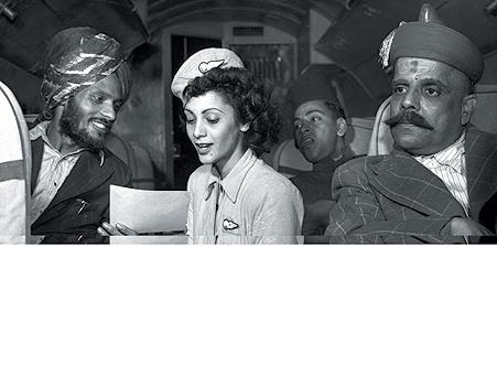 Only 21 air hostesses were on the rolls, Anglo-Indian girls all (‘full-blooded native women’ refused to serve).Hired at a monthly salary of $106.23 (uniforms free), they were trained by an American hostess from TWA. Most were based in Bombay and, if Life magazine is to be believed, jitterbugged for recreation between flights. Margaret Bourke-White, Life’s intrepid staff photographer, captured this image on a Delhi-Bombay flight for the magazine’s September 30, 1946 edition. Here, 21-year-old air hostess Monica Gilbert shares the flight report with a Sikh passenger, who doesn’t seem particularly interested.