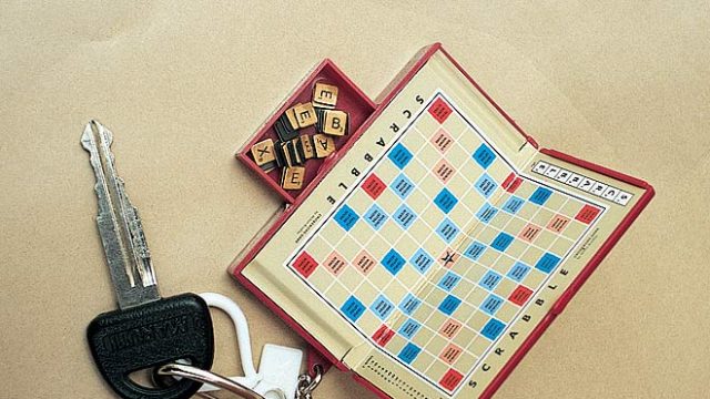 This scrabble key ring has all the tiles and letter racks for two players