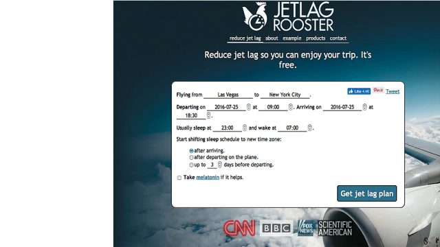 In a better world, the horrific malady called jet lag would not exist. It is, of course, the bane of the frequent flyer—where sleep is elusive, your biological clock is thrown out of whack and your brain functions slower. The chronically jet-lagged should check out this website, which will help you become fully functional in no time. Just visit the website Jetlagrooster, enter your flight details and provide information on your regular sleep pattern. Choose when you would like to begin shifting your sleep cycle, click on the big blue button on the right and there you go—a comprehensive schedule custom-designed for you. Your ‘jet lag-eradication plan’ will give you a day-by-day guide on how you must spend your time. So, you will be told when to seek light, when to avoid it and when to try and sleep. The website also offers a few tips on how to reduce fatigue—such as drinking water or eating fruit.