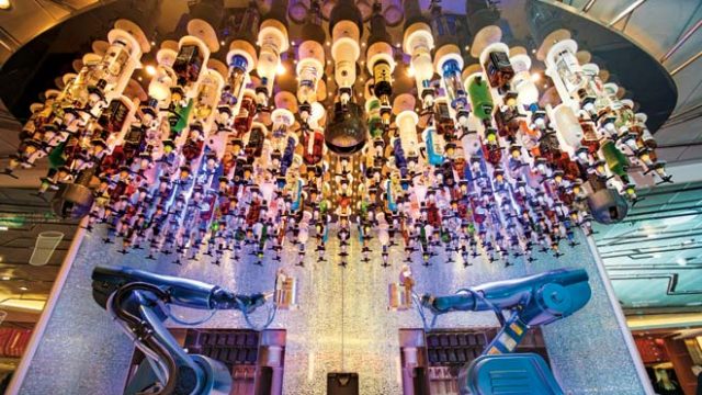 I did a round of the ship’s eateries — 18 restaurants and seven bars — and got a taste of what the fuss was all about. The first stop on the jaunt was Chic, which lives up to its name. There was The Grande, of course, followed by Silk, a Chinese restaurant that offers a more social atmosphere. After this came the casual American Icon Grill, the Vintages Wine Bar (it lingers in my thoughts mainly because of the 500-plus wines it serves), Wonderland (quite special — imaginative food, lovely décor, and special textures and flavours), Izumi (typical Japanese, superb sushi), the Chops Grille (Royal Caribbean’s signature steakhouse) and the Bionic Bar (made-by-robots cocktails, aptly by a method called makershaker). Splendid!