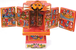 It was love at first sight at Dilli Haat. I was looking for a present for my cousin and his new wife when these open doors beckoned. Provenance: Bassi, Chittorgarh, Rajasthan. Some large ones, about a foot high, some small, the size of my palm. I peered inside one — the doors unfolded, and on panel after panel there were stories begging to be told. ‘Jangli kahaani’ announced one box painted in green with tales from the Panchatantra. Others had mythologies. Dwarka Prasad Jangid, the craftsman, took me through the stories — the Ramayana, the lilas of Krishna, Dashavatara… I returned again to a small one that seemed most right — blazing red and utterly charming. Rs 250, he quoted. I’m a notorious bargainer but I paid up quietly.
