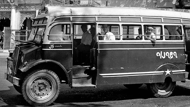 A bus stops to pick up commuters in front of the Sule Pagoda, a monument that would later become the focal point of multiple political uprisings;