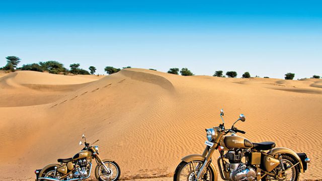 Riding around Rajasthan on a motorcycle is like being dropped into a period drama, where the architecture, the people, the customs and the landscape look very much like they did a hundred years ago. Royal Enfield’s Classic 500 is a rather convincing retro motorcycle too, in the way it looks at least. But it’s also a modern electronic fuel-injected machine launched in late 2009 that carries on the spirit of the original. Two new variants of the Classic 500 were revealed recently at The Serai, an elegant and luxurious tented camp, cleverly tucked away in the scrublands, thirty kilometres outside Jaisalmer.