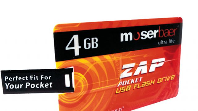 Moser Baer Zap USB flash drive with plug-n-play mechanism and a 4GB memory looks like plastic money