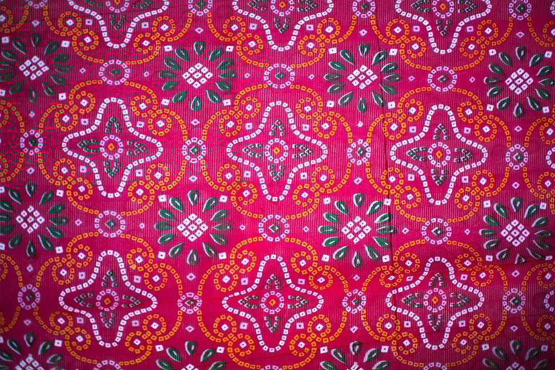This distinctive tie-and-dye work is characterised by patterns on vibrant backgrounds, created by pinching and pushing small portions of the fabric into small points, and knotting and twisting them with the help of thread. The fabric is then dyed in different shades of colour, thereby leaving the knotted parts uncoloured.