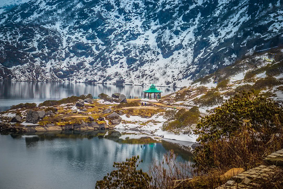 Tsongmo Lake, Sikkim, a serene glacial lake framed by rugged Himalayan slopes Photo: Shutterstock