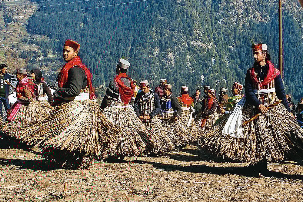 People in skirts made of sharuli grass celebrate Faguli in Tirthan Valley, Himachal Pradesh Photo: Vipul Sokhiya, Documentary Photographer