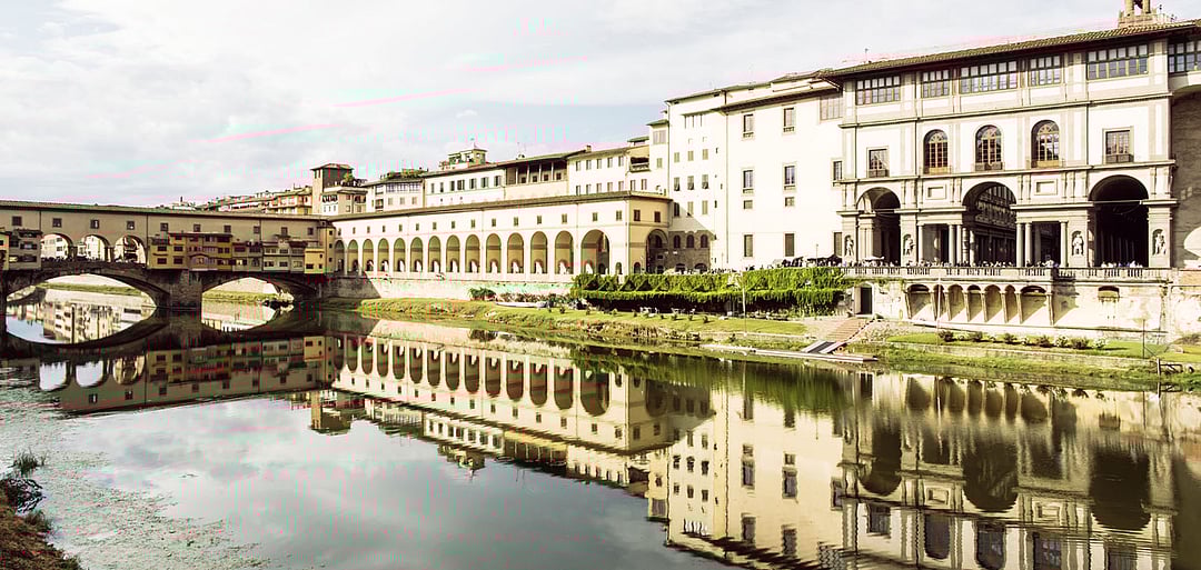 Vasari Corridor and Uffizi Gallery are mirrored in the river Arno, Florence Photo: Shutterstock